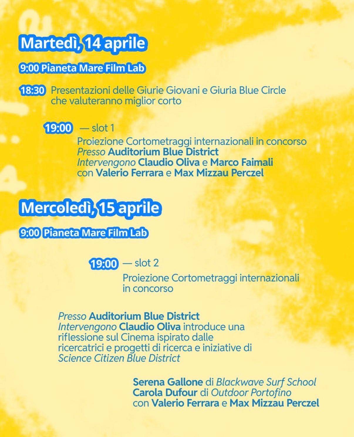 Entrambe le iniziative sono organizzate da Pianeta Mare Film Festival in collaborazione con Blue District, Università di Genova, Iren, Tetis, Posidonia Green Festival, Outdoor Portofino, Blackwave Surf School.