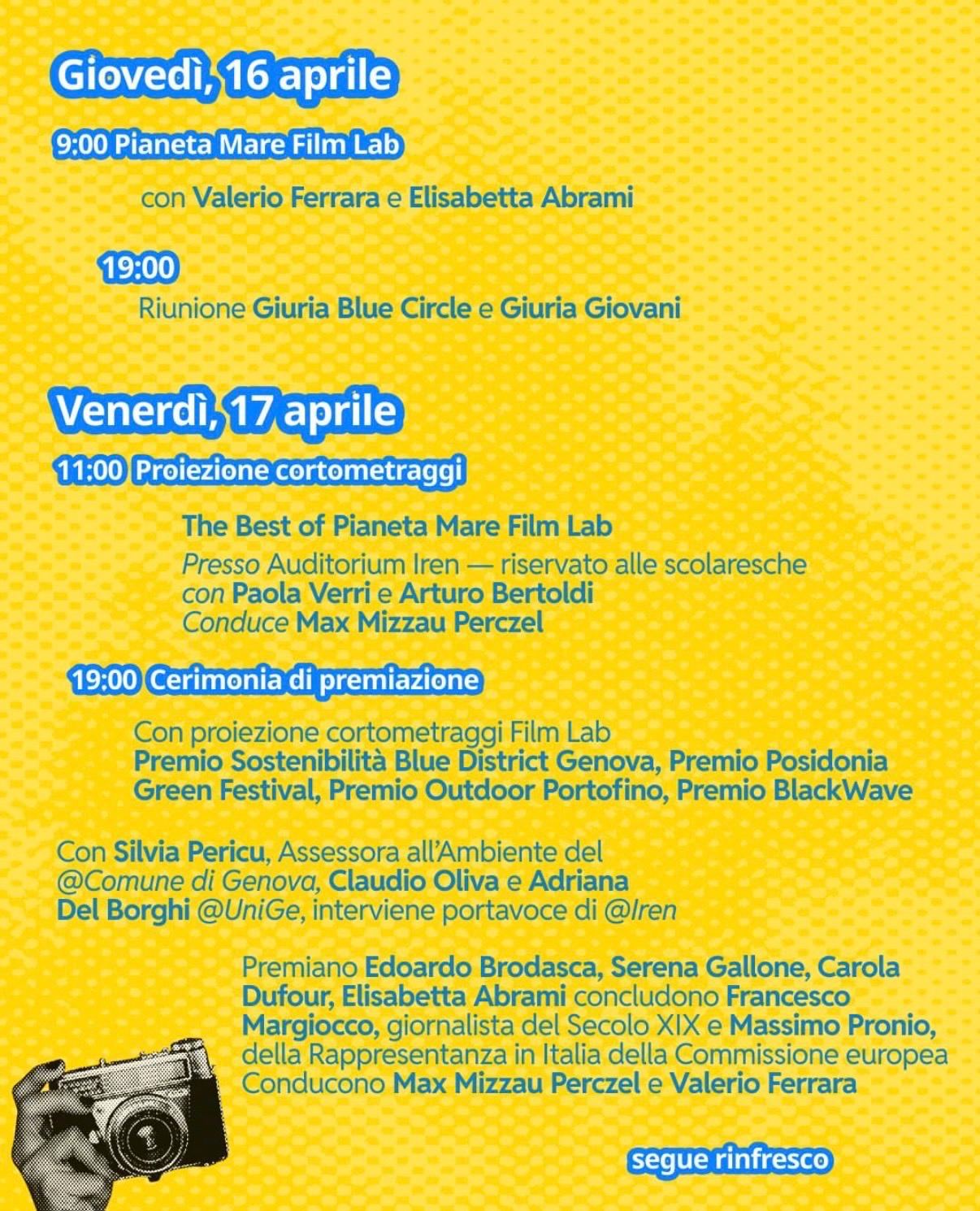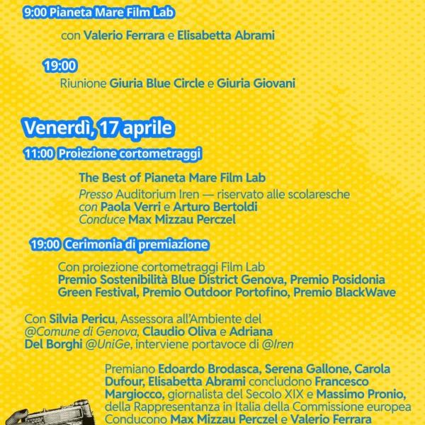 Nella stessa settimana ci sarà anche il Pianeta Mare Film lab di Genova: una residenza artistica in cui i film maker U30 selezionati attraverso una call realizzeranno cortometraggi sul mare con lo smartphone, a zero budget e zero impatto ambientale.