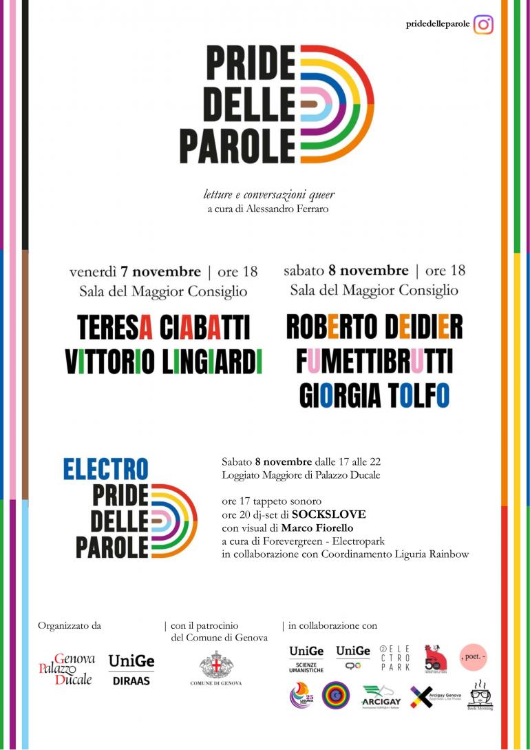 Venerdì 7 e sabato 8 novembre 2025, nel Salone del Maggior Consiglio di Palazzo Ducale, si terrà la terza edizione del Pride delle parole, a cura di Alessandro Ferraro.