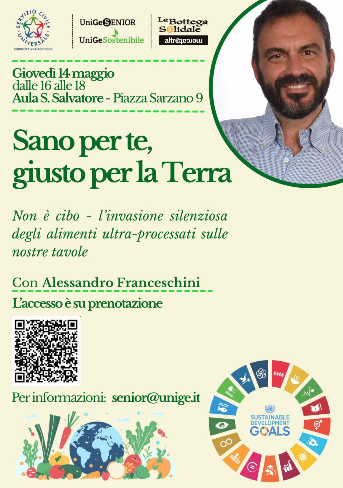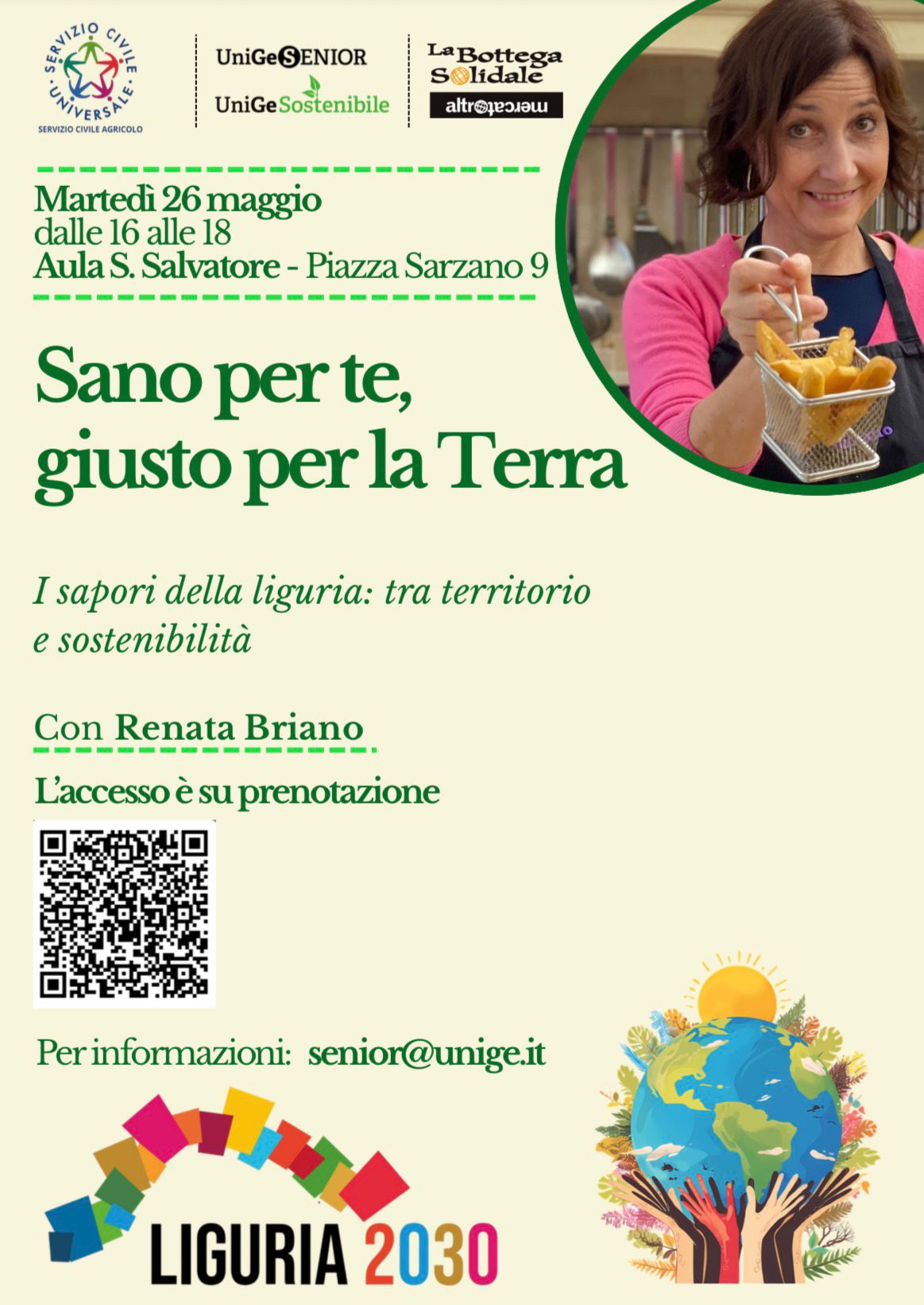 Nei giorni 14 e 26 maggio, presso l'Aula San Salvatore (Piazza Sarzano, 9), si terrà il ciclo di eventi "Sano per te, giusto per la Terra", organizzato dalle volontarie e i volontari del Servizio Civile Agricolo, nell'ambito del progetto "UniGeSenior&Sani: la cultura dell'agroalimentare biologico Made in Italy per un invecchiamento sano e felice".